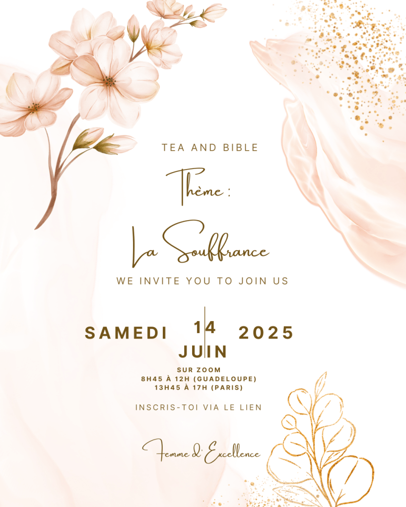 P.S: Ne viens pas seule, partages autour de toi le lien d’inscription. Le jour J n’oublie pas de venir également avec ton équipement, tu auras besoin de t’installer confortablement munie de ta tasse avec la boisson de ton choix, de tes notes et bien évidement l’essentiel Your Bible!