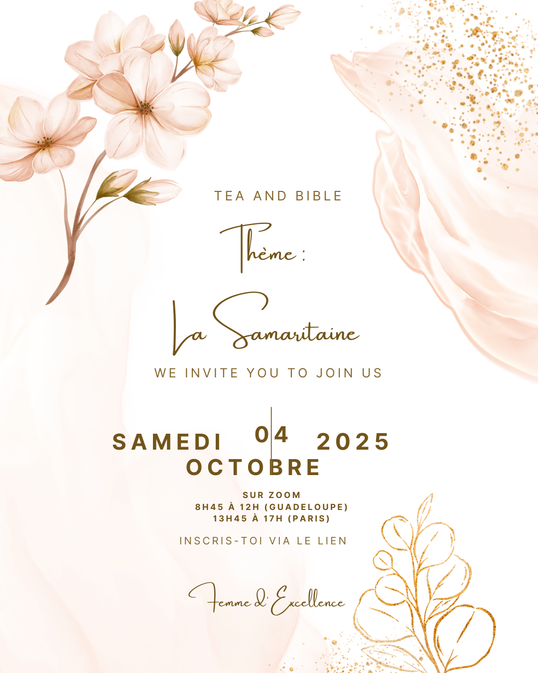 Quelle joie de partager avec toi nos échanges sur la thématique de la Femme Samaritaine alors sois richement bénie à travers ce canal de prière et d’encouragement pour Ta Vie ! Si ce n’est pas encore le cas, nous avons hâte d’échanger et de partager ensemble alors inscris-toi vite aux prochaines sessions en suivant l’agendaLire la suite « Tea and Bible #9 Octobre 2025 partie 1 »